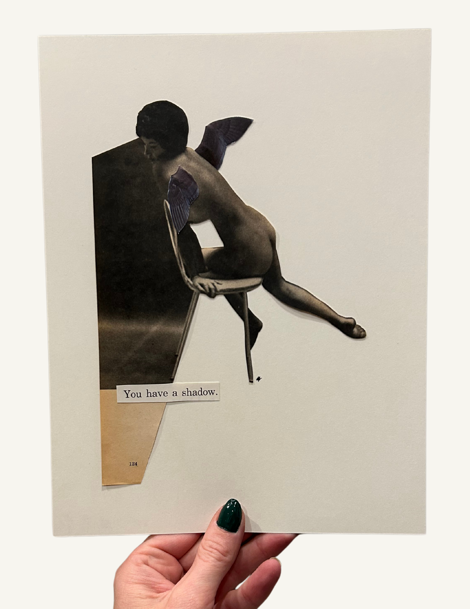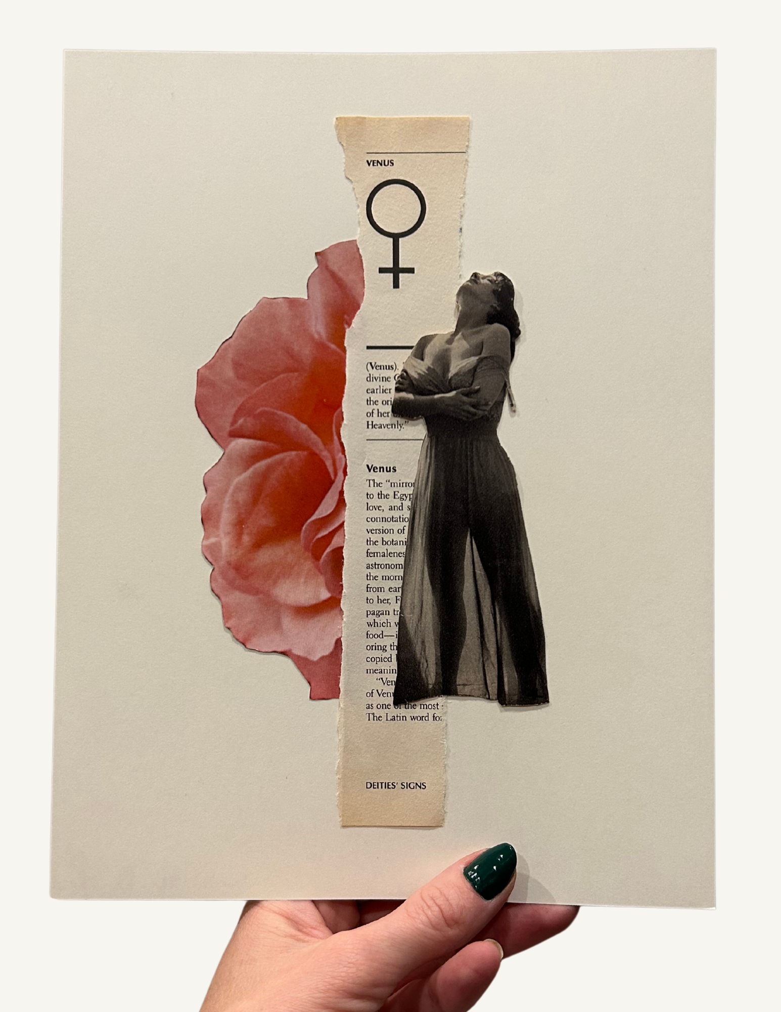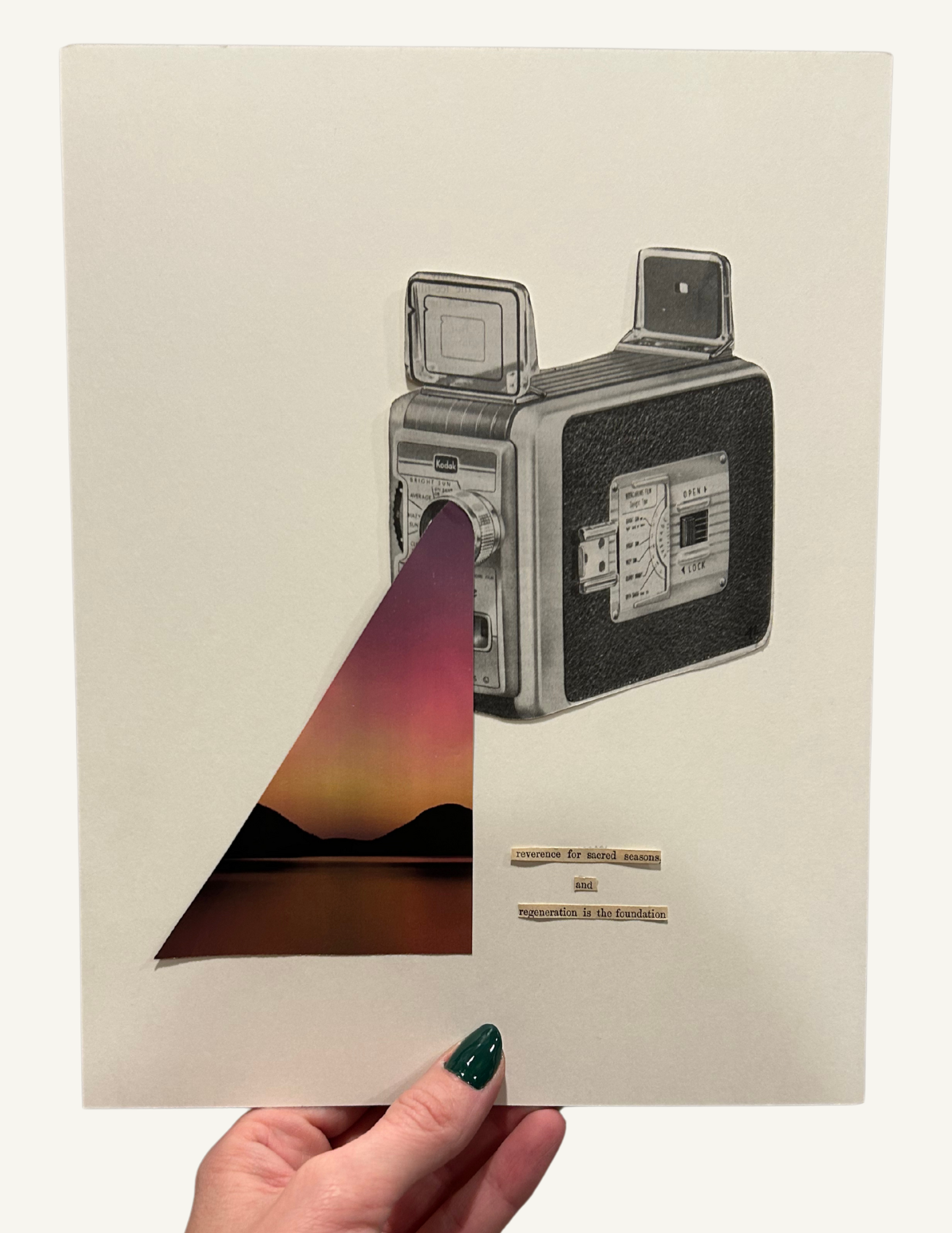 each analog piece begins with a feeling; selected imagery that stirs something within. fragments from the past, found visuals and textiles, or print ephemera that holds meaning beyond the original context. exacting cuts and intuitive composition, i layer paper to create new relationships between symbols and space. the process is tactile and meditative; sliding, shifting, and settling elements into place until the picture resonates with distinct meaning. final works often feel surreal and emotionally charged. rooted in personal reflection, yet open to interpretation; these collages are built slowly, by hand, as quiet conversations between past and present, seen and unseen.