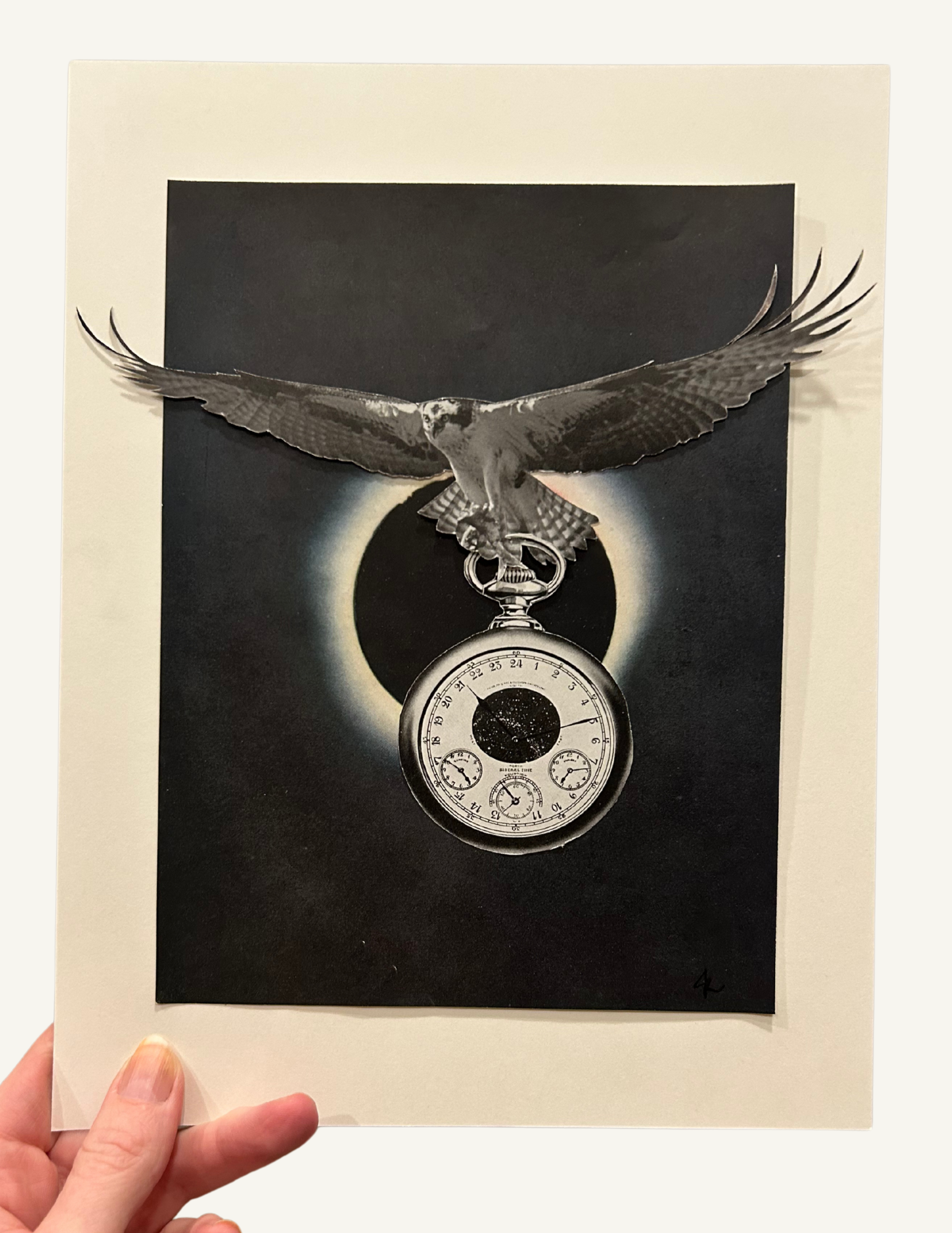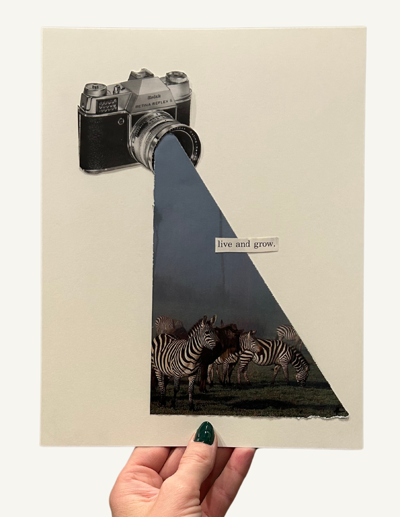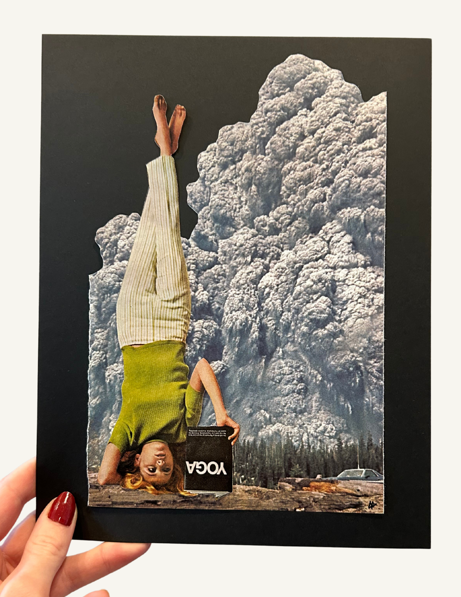 each analog piece begins with a feeling; selected imagery that stirs something within. fragments from the past, found visuals and textiles, or print ephemera that holds meaning beyond the original context. exacting cuts and intuitive composition, i layer paper to create new relationships between symbols and space. the process is tactile and meditative; sliding, shifting, and settling elements into place until the picture resonates with distinct meaning. final works often feel surreal and emotionally charged. rooted in personal reflection, yet open to interpretation; these collages are built slowly, by hand, as quiet conversations between past and present, seen and unseen.